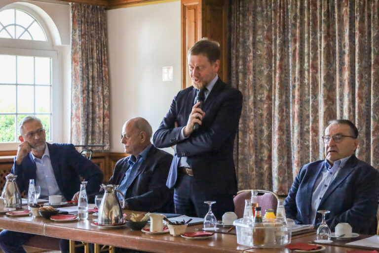 Auf Einladung des Wirtschaftsforum Elster Röder e.V. war am 18.04.2024 der sächsische Ministerpräsident Herr Michael Kretschmer zu Gast im Dreiseithof in Gröditz. Der Vorsitzende nahm den Ministerpräsidenten in Empfang, gemeinsam gingen Vorstand und MP zu den bereits wartenden Teilnehmern, um das Treffen im Bild festzuhalten. Über 40 Geschäftsführer, leitende Mitarbeiter aus führenden Unternehmen sowie Kommunalpolitiker und Landräte aus der Region Elster-Röder und darüber hinaus, bis an die Elbe, z.B. Wacker aus Nünchritz und Feralpi aus Riesa, waren der Einladung des Wirtschaftsforums Elster-Röder e.V. gefolgt. Der Ministerpräsident nahm sich Zeit, um mit den anwesendem Vertretern der regionalen Wirtschaft über aktuelle Probleme, z.B. Energie, Migration, Fachkräftemangel und Verkehrswegeplanung zu sprechen. Aber auch die anstehenden Landtagswahlen waren ein Thema. Genauso wie die Verbesserung der interkommunalen Zusammenarbeit in der Region. Auch Christian Jaschinski, der Landrat des Elbe-Elsterkreises und Tilo Lindner, der den Landrat des Landkreises Meißen vertrat, nutzten die Gelegenheit und brachten sich in die Diskussion ein.